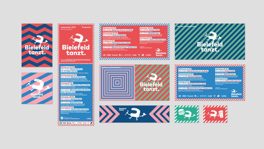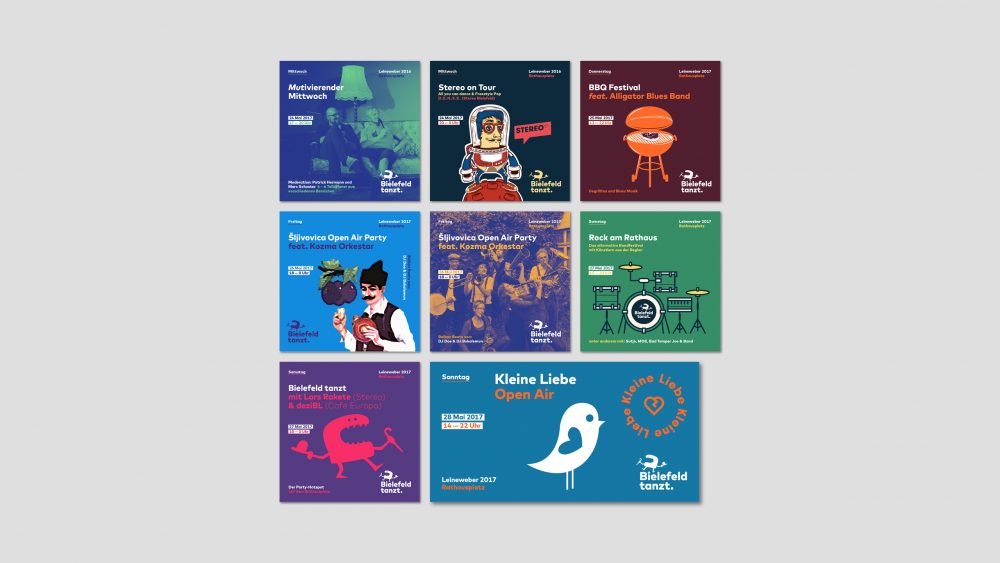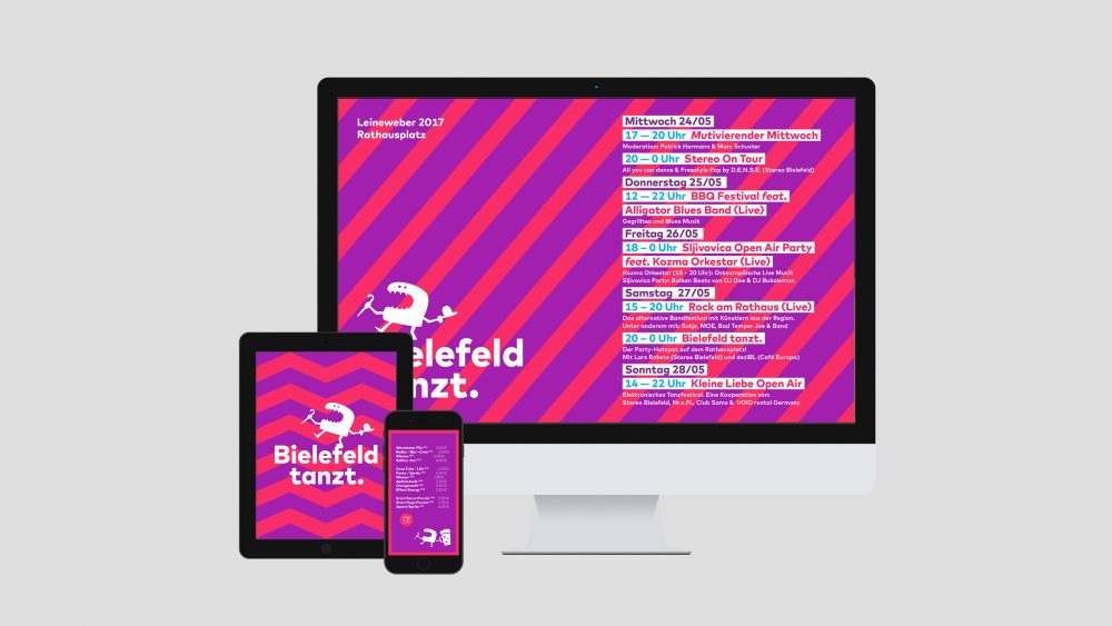 “Bielefeld tanzt” - Der Name ist Programm. Für den renommierten Leinewebermarkt Bielefeld durften wir mit einer eigenen Bühne und eigenem Bereich auf dem Rathausplatz unseren Beitrag für ein alternatives, diverses und modernes Programm beisteuern. Ziel war es, mit unserem Verständnis von “frischem Wind” das beliebte und traditionsreiche Stadtfest für unsere Zielgruppen mitzugestalten. Konzeption, Marketing und alle Gestaltungen stammen aus unserer Feder. Ebenso hat 2p Media die Realisation und Durchführung des mehrtägigen Events organisiert.